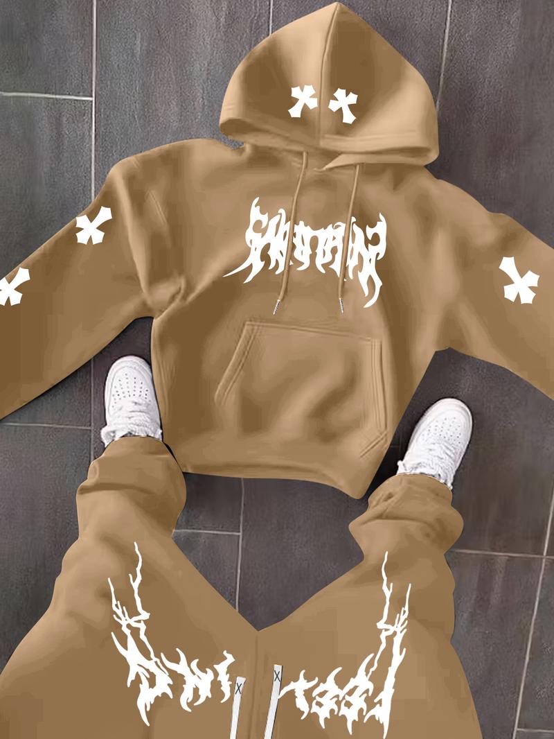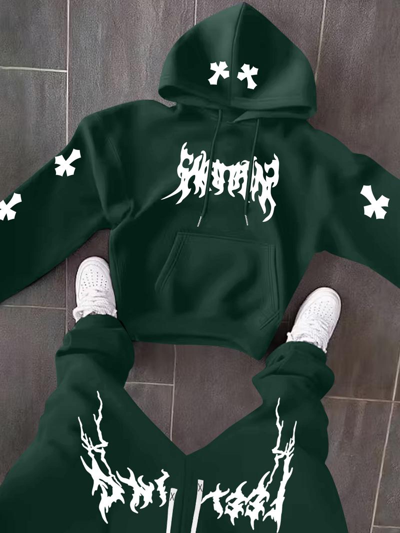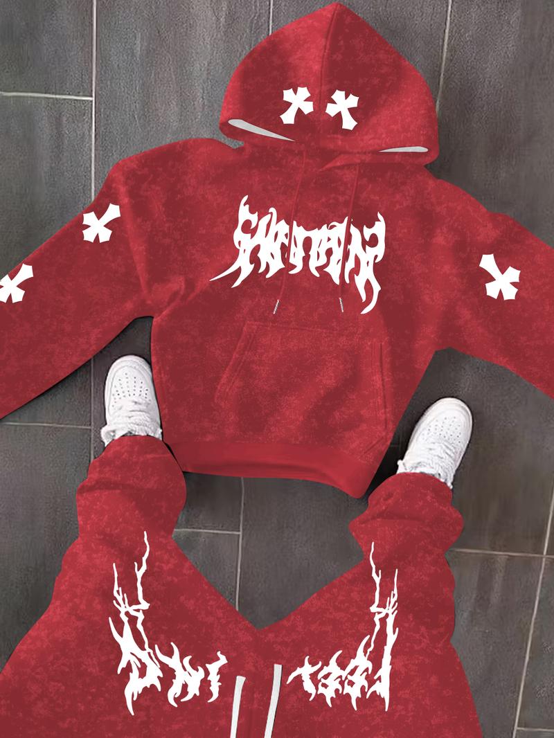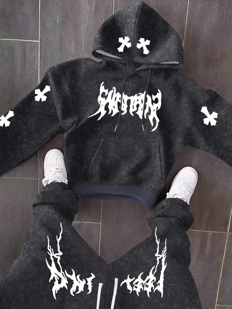 The Men’s Black Hoodie and Pants Set features lightning-style white cross prints on the sleeves and legs for a striking contrast.