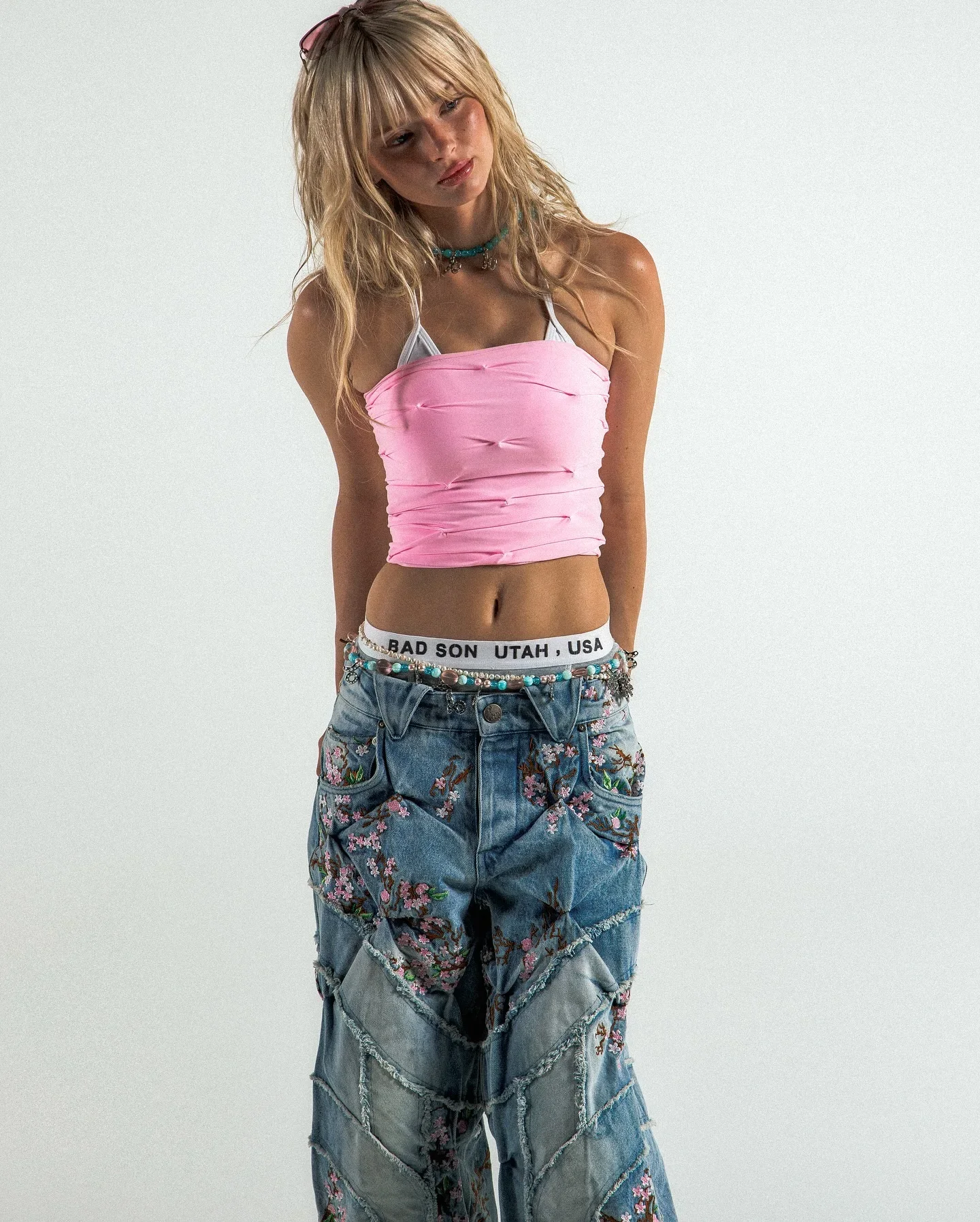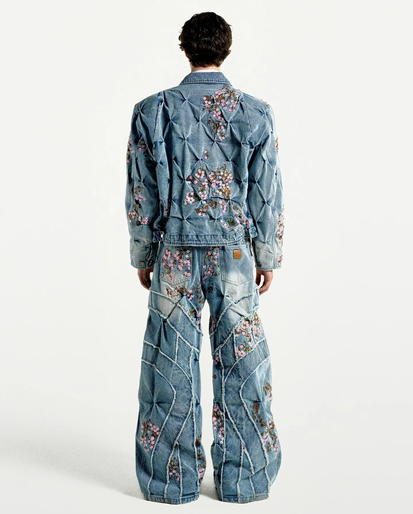 Vintage Harajuku denim pants with cherry blossom embroidery. Wide-leg design, unisex fit, and artistic streetwear vibe — a perfect mix of comfort and creativity. 🌸