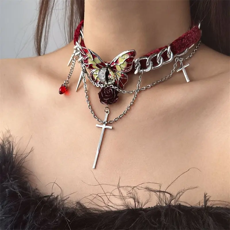 A dramatic gothic choker featuring a blood-red butterfly centerpiece, metal spikes, chains, and cross pendants. 🖤