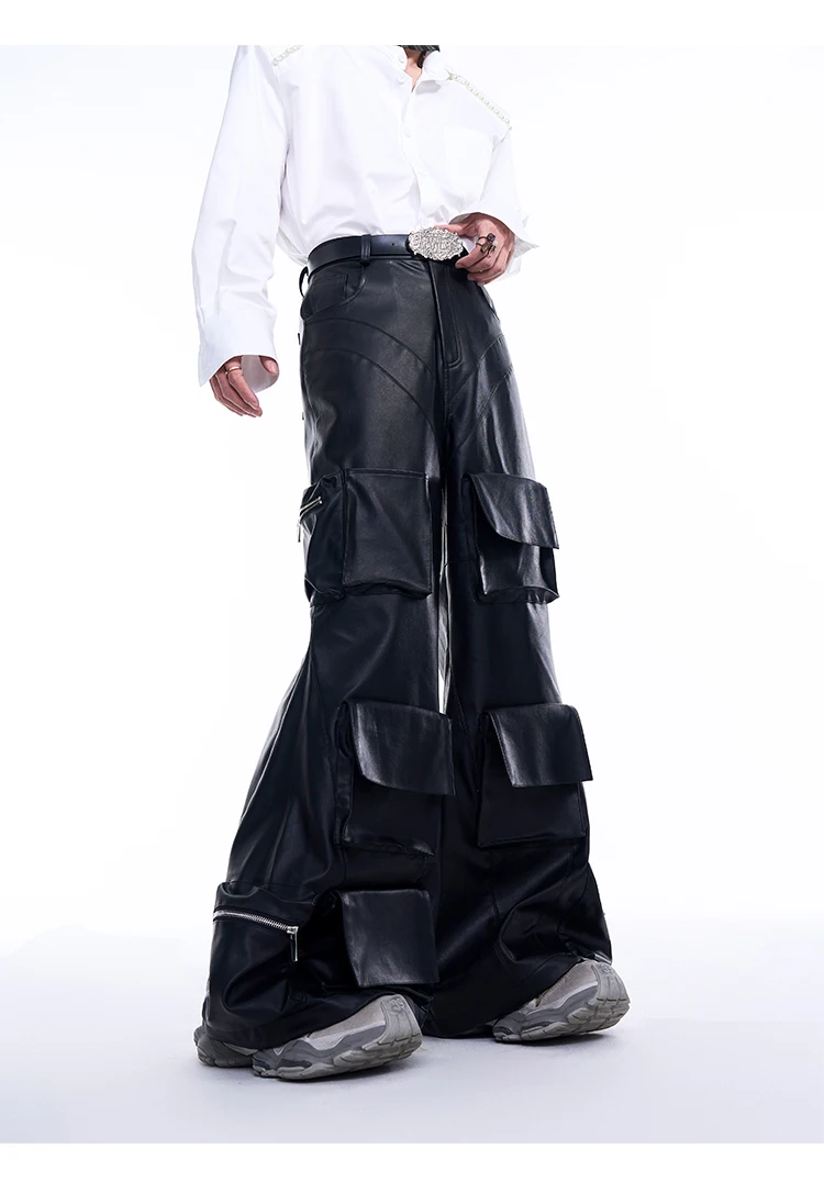 “Dark PU Leather Cargo Pants – Wide-Leg Designer Fit with 3D Pockets | Emo Streetwear Edition”
