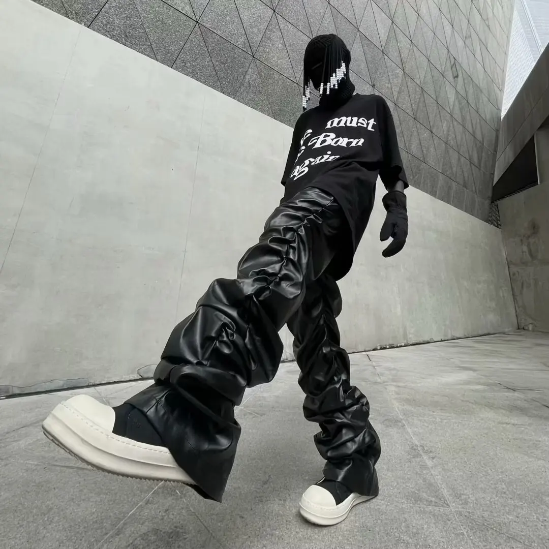 Bold PU leather pants with a loose hip-hop fit and Harajuku pleated style. Comfortable, stylish, and perfect for Y2K + streetwear looks.