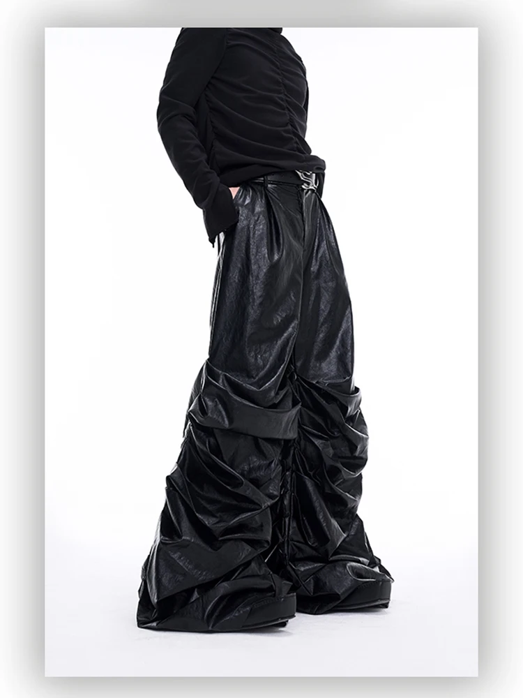 These black PU leather stacked pants feature a soft texture, wide-leg design, and a luxury street look made for 2025 style.